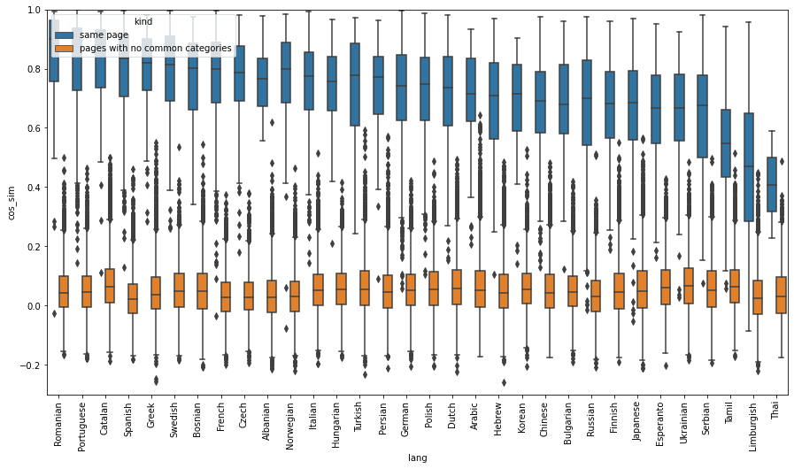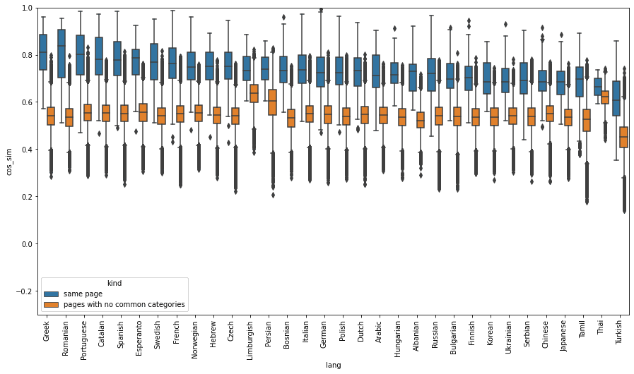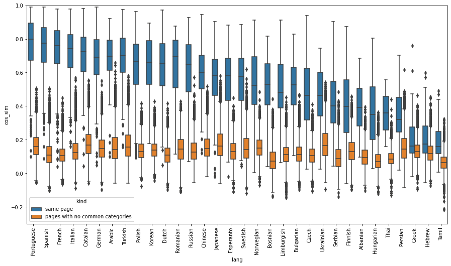 (c) LASER3Fig. Distribution of cosine similarity scores of positive ( cross-lingual pairs of same news) and negative (cross-lingual pairs of unrelated news) title pairs, grouped by languagesSBERT paraphrase-multilingual-mpnet-base-v2 model and LASER3 model have similar cosine similarity scores across all languages, except Tamil, Limburgish, and Thai in SBERT paraphrase-multilingual-mpnet-base-v2 model. On the other hand, on SBERT distiluse-base-multilingual-cased-v, average cosine similarity of positive sentence pairs varies widely depending on languages, from ~0.8 in Portuguese to ~0.2 in Tamil. Due to the language bias, a sentence retrieval model built with this embedding model could rank Portuguese sentences that are not that similar to an English query much higher than a Hebrew sentence which has the exact same meaning as the query.LASER3 gives higher cosine similarity scores for positive pairs (average 0.7~0.8), but also for negative pairs (average ~0.55, in contrast to average 0.05 for SBERT). Even though LASER3 was trained on 200 languages including all 32 foreign languages that are on our evaluation datasets, they struggle to distinguish between similar news titles and dissimilar news titles on some English-foreign language (e.g., Thai) title pairs. We can conclude that SBERT(paraphrase-multilingual-mpnet-base-v2) is the best of the three models discussed here for the multilingual sentence similarity search task, since the differences between the cosine similarities of positive sentence pairs and the negative sentence pairs are the largest on average. This result shows that it is important to know if your model has a language bias in languages of your interest.Note here that positive sentence pairs used here are not exactly semantically same, as you see in the example positive pairs shown above (e.g.., a positive pair “United Kingdom buries Queen Elizabeth II after state funeral” and ”大不列顛及北愛爾蘭聯合王國女王伊麗莎白二世陛下逝世,享耆壽96歲 (translated: Her Majesty Queen Elizabeth II of the United Kingdom of Great Britain and Northern Ireland dies at 96)”). Thus, we don't expect cosine similarities of the positive pairs to have the value exactly, or very close to 1.
