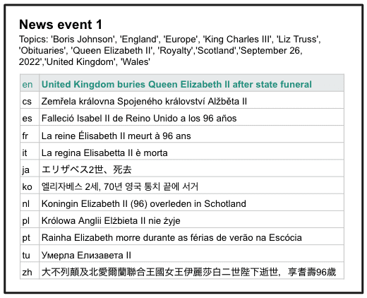 A truly language-agnostic multilingual language model is one where all semantically similar sentences are closer than all dissimilar sentences, regardless of their language.Examples of known multilingual sentence embedding models which were trained on a large number of languages are, LaBSE(109 languages) [1], multilingual SBERT(50+ languages)[2,3], and LASER3 (200 languages)[4]. Do these models perform well on retrieving semantically similar sentences from a pool of documents with 10s of different languages?Here we investigate the multilingual sentence embedding models on their ability to identify semantically similar (but not exactly same) sentences by taking a look at news titles in 33 languages. 15,210 multilingual news titles were scraped from all news articles that have links to English WikiNews in non-English languages. A list of languages in the dataset is, English, French, German, Portuguese, Polish, Italian, Chinese, Russian, Japanese, Dutch, Swedish, Tamil, Serbian, Czech, Catalan, Hebrew, Turkish, Finish, Esperanto, Greek, Hungarian, Ukrainian, Norwegian, Arabic, Persian, Korean, Romanian, Bulgarian, Bosnian, Limburgish, Albanian and Thai. Then, sentence similarity of the English news title and the foreign news title of the same news (positive pairs), as well as of the news which has no common categories (negative pairs) were calculated. For example, a WikiNews article titled “United Kingdom buries Queen Elizabeth II after state funeral” has linked articles in 11 other languages. Their titles are shown below.