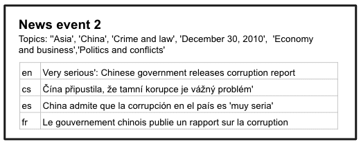 On the other hand, a WikiNews article titled “Very serious': Chinese government releases corruption report”, which has no overlapping topics with the news above, has linked non-English news articles with following titles.