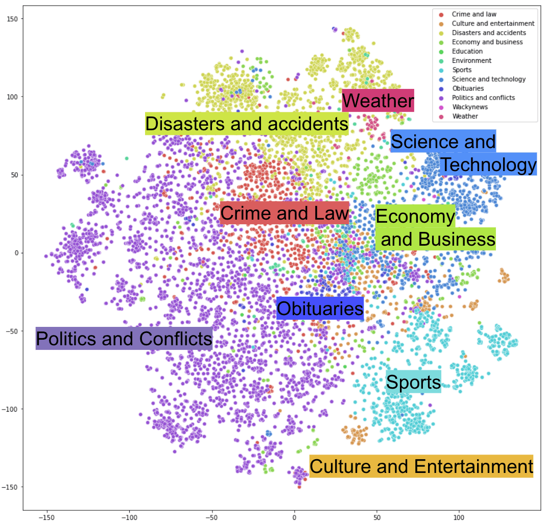 To further understand how embeddings of news titles are distributed in the multilingual semantic embedding spaces, we visualized them in 2 dimensions. A figure below shows the distributions of news titles embedded with the SBERT(paraphrase-multilingual-mpnet-base-v2) model. The dimension of the embedding space was reduced to 2D using a dimensionality reduction technique called t-SNE, which preserves local structure of the clustering.Sentence embeddings are colored 13 news topics defined by the WikiNews: Crime and law, Culture and entertainment, Disasters and accidents, Economy and business, Education, Environment, Heath, Obituaries, Politics and conflicts, Science and technology, Sports, Wackynews, Weather. Here, I excluded news titles which have more than one of the 13 topics.