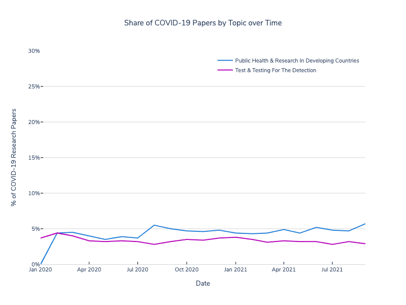 Two topics of research that held steady as a proportion of all COVID-19 research were around public health and testing.