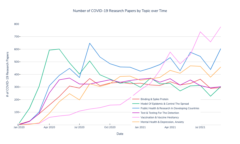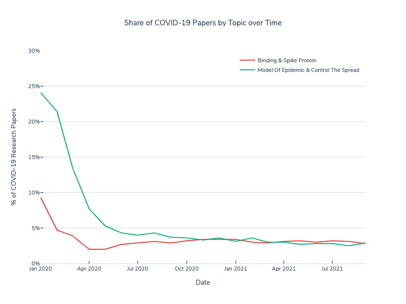 In the very early days of the pandemic, the majority of the focus was centered around understanding the biology of the virus and its epidemiology. By April 2020, many large cities in the US and around the world had imposed lockdown measures, an indication that research with the topic “Model of Epidemic and Control the Spread” was reaching policy makers. Soon after, the share of research dedicated to the disease’s spread and genetic make-up dropped off. It’s important to note that the large percentage of research in the early days dedicated to these topics may have been influenced by previous research into epidemic spread and spike proteins, making it more accessible, as well as the relatively low volume of all research compared to just a few months later.