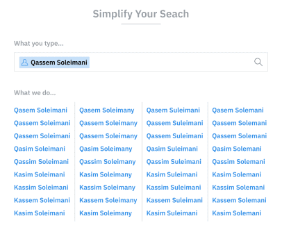 Variations among transliteration guides and ad-hoc decisions among content publishers result in multiple spellings for the same individual across a large corpus of text. If you are an analyst, you know this problem all too well. To run a simple search on a person of interest, you will find yourself writing complex boolean expressions like the ones shown below. Sample Query #1 shows some spelling variations you would write if you were running a search on the airstrike that led to the death of Qassem Soleimani. Meanwhile, in Sample Query #2, the search is for Egyptian President Abdel Fattah el-Sisi’s policy in the Sinai Peninsula.