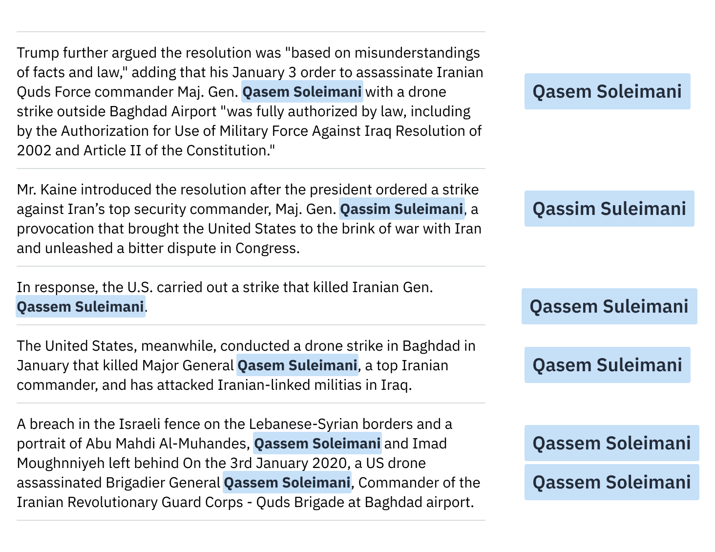 Extract from Primer Platform query on Qassem Soleimani, highlighting the different spellings of his name.