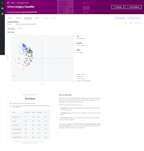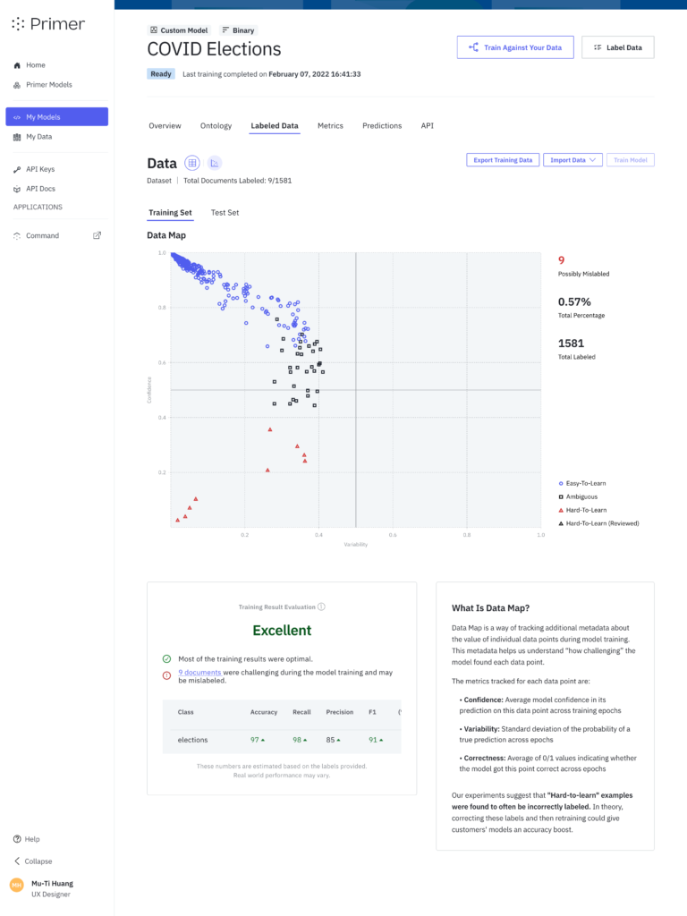 Data Map is a key utility for quality assurance of datasets in Primer, saving customers time by allowing them to review a subset of examples for errors rather than the entire dataset. Techniques like Data Map are particularly powerful because they help customers to get more performance out of existing data, rather than label new data and are an obvious example of Primer’s focus on data efficiency. We’re determined to make time-to-value short so customers can hit the ground running on their projects with a performant model.